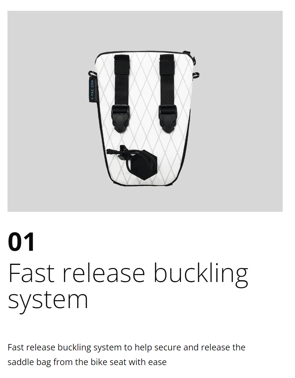 Hexa.go products use only the best material: USA made X-Pac® fabric that is 100% water-proof, lightweight and durable. This makes the Hexa.go saddlebag ultra-light, water-proof and one of the most compact design. We have proudly incorporated a fast release buckling system so it can be mounted on the bike effectively (either on handlebars or saddle rails) or converted into a trendy cross-body bag in no time. This allows the rider to neatly transfer their daily essentials from riding to anywhere else they need to be, keep it simple and sophisticated.